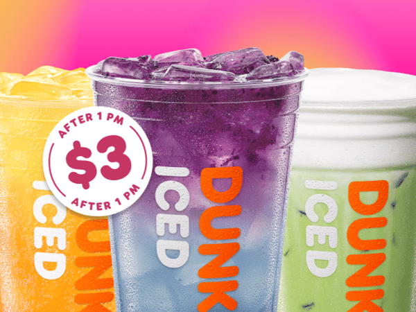 Sip and save after 1PM! Push through the PM with Dunkin' and grab $3 medium Dunkin' Refreshers, Dunkin' Energy, Matcha, and Lemonades starting at 1PM - now through 11/4. Terms and excl. apply. Participating locations only.Order Now